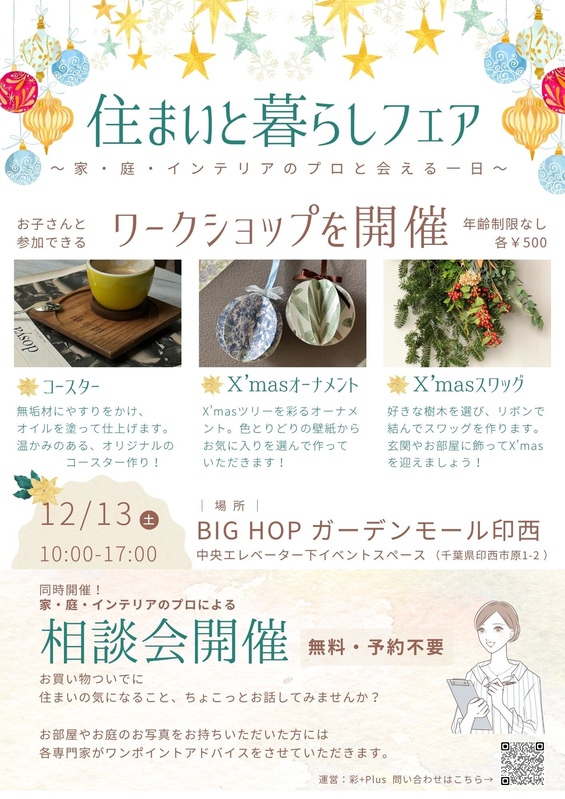 住まい、庭、インテリアのプロによる、一日限定のワークショップを開催いたします。
