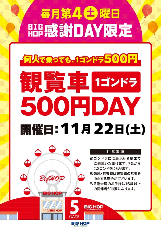 観覧車1ゴンドラ500円!(最大6名様まで)