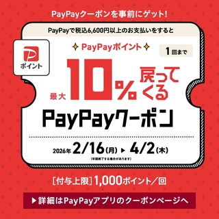 ・期間:2026/2/16(月)~2026/4/2(木) ・対象:税込6,600円以上購入 ・上限:1,000ポイント(1万円決済分まで) ・回数:1回限り ※クーポン付与総額が所定の金額に達した場合、期間前に終了する場合がございます。 【クーポンの取得はこちら】 URL:https://s.paypay.ne.jp/EZqTap