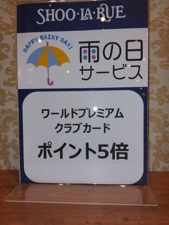 シューラルーでは雨の日にご来店、お買い物していただくと、ワールドプレミアムクラブポイントを通常の5倍で付与させていただいてます♥ポイントが貯まるアプリは無料でお作りいただけます。 貯まったポイントは1ポイント単位で次のお買い物に使えるので、是非雨の日はシューラルーへGO!!ご来店お待ちしております!5倍実施はシューラルー印西店のインスタグラムでお知らせしてますので是非フォローもお忘れなく♪