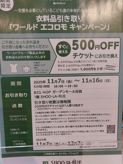 11/7~11/16期間中、支援を必要としている子供達の未来に役立てる衣料品引き取りエコロモキャンペーンを開催中です。ご不要になった衣料品1枚に対して直ぐに使える500円Offチケットに引き換え。3300円毎に1枚ご利用可能。リユースを目的としているため、汚れ破れなどの不良品はお引き取りできません。
