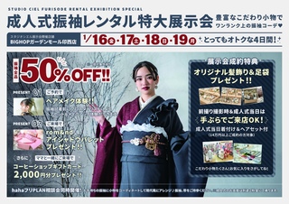 ❤️成人式振袖レンタル✨50%OFF 特大展示会 開催✨ 来場特典🎁 ・プロによるヘアメイク&プレ撮影無料体験 ・ママと一緒の来店で有名コーヒーショップチケット進呈 何着試着してもOK、成約後の振袖変更も可能◎ 写真館だからこそ実現できる特別価格でご案内します。